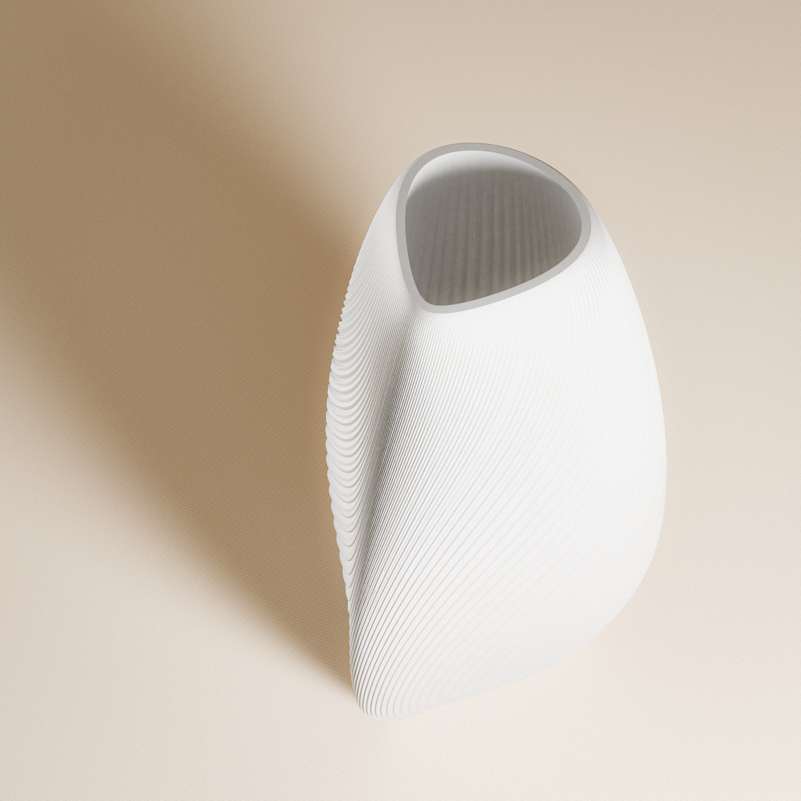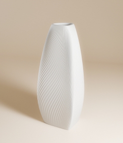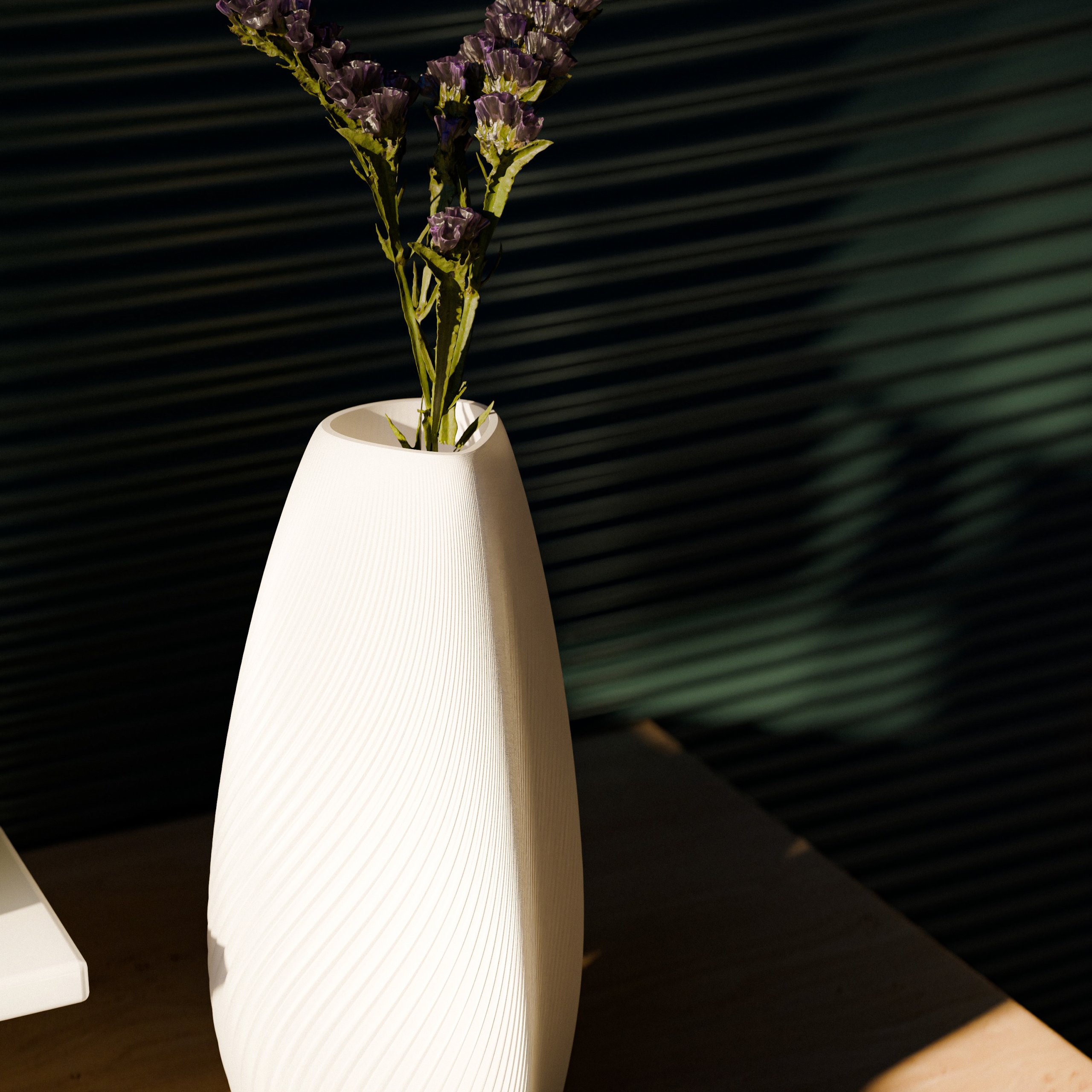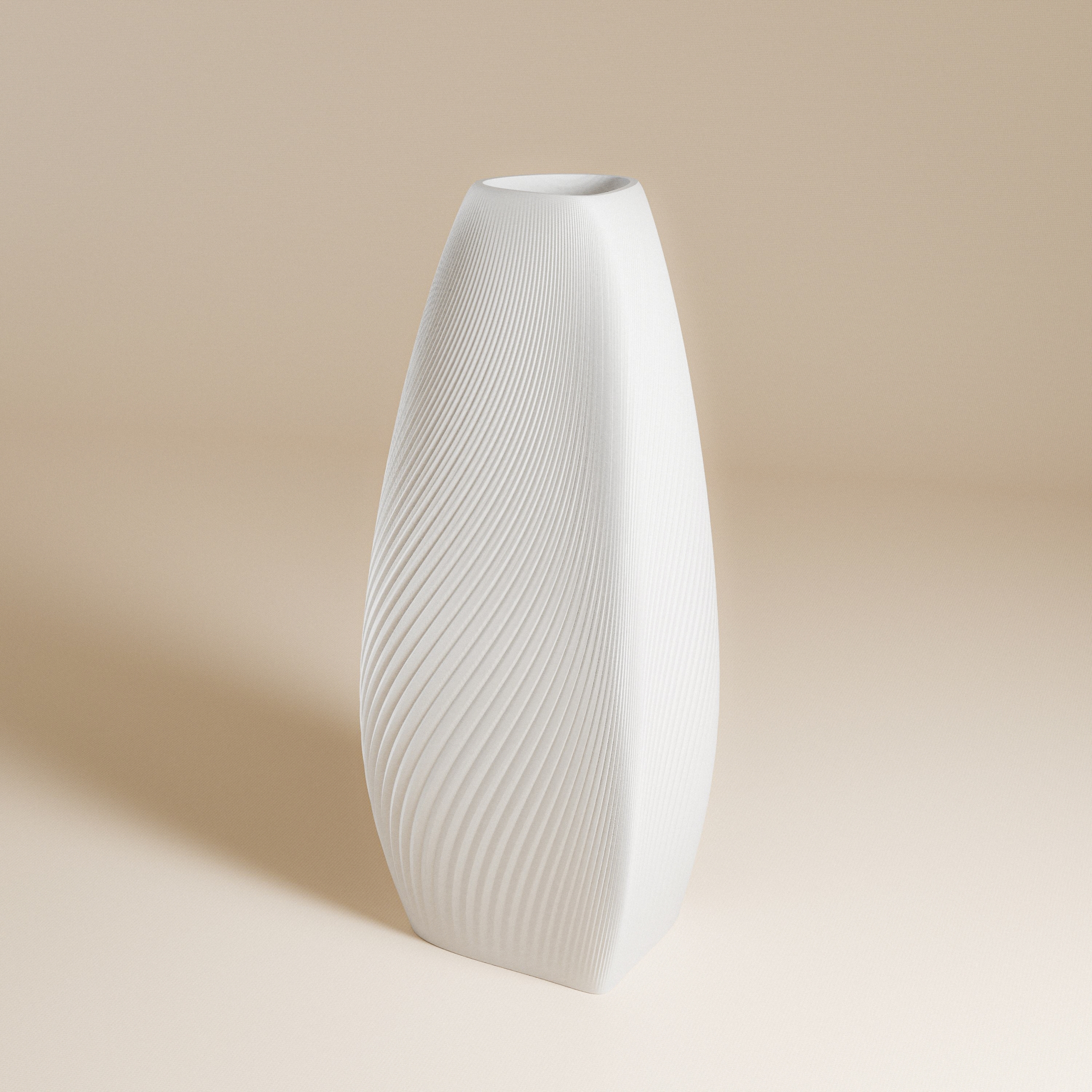 Un florero moderno impreso en 3D con una sutil textura en espiral que aporta elegancia y armonía a cualquier ambiente.