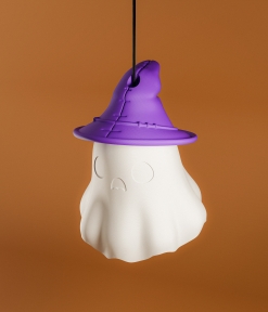 Pantallas colgantes con forma de fantasma, impresas en 3D y totalmente funcionales. Personalizables, fáciles de imprimir y de armar, ideales para dar luz y carácter a tu decoración de Halloween.