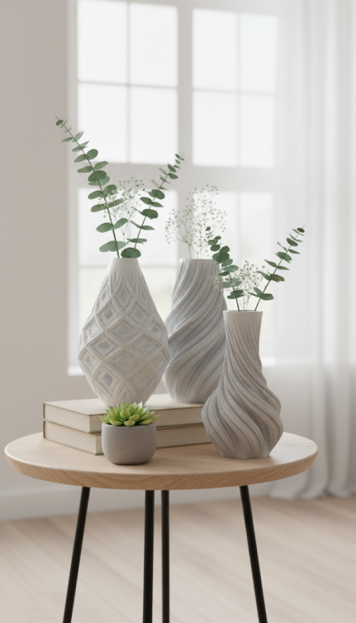 Cada florero tiene una textura única que juega con las sombras y formas, logrando un efecto moderno y elegante: