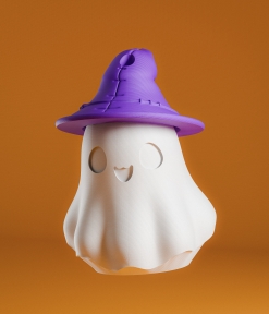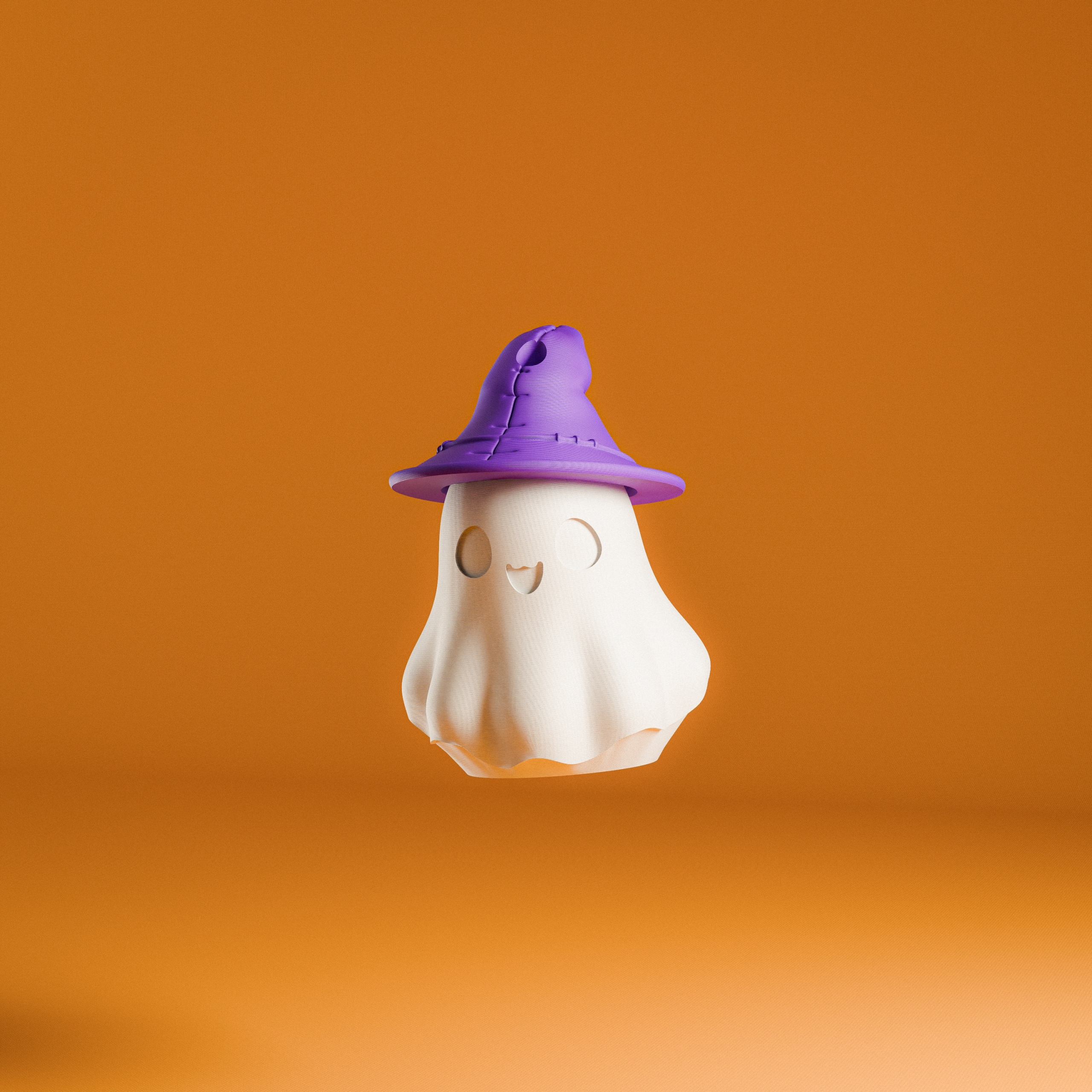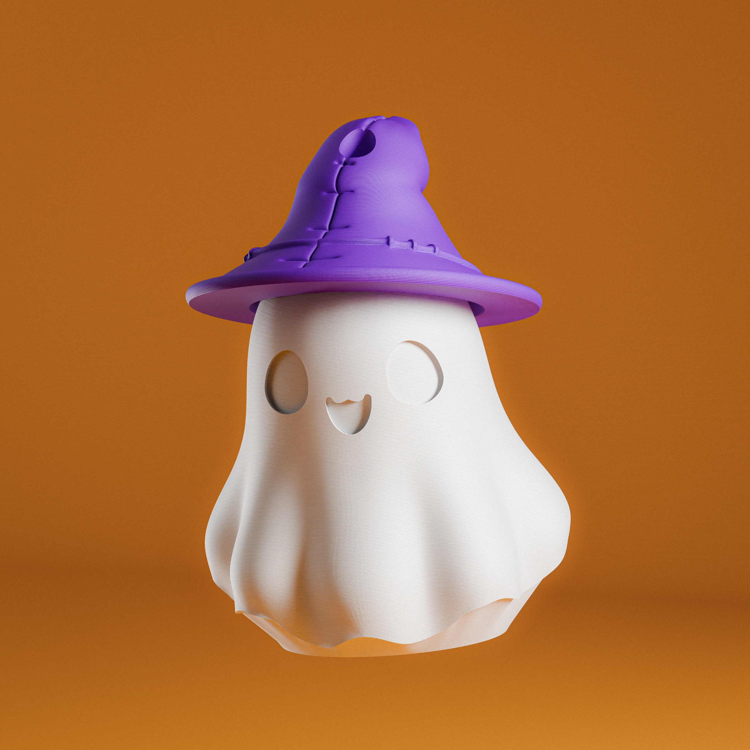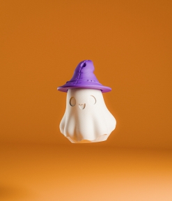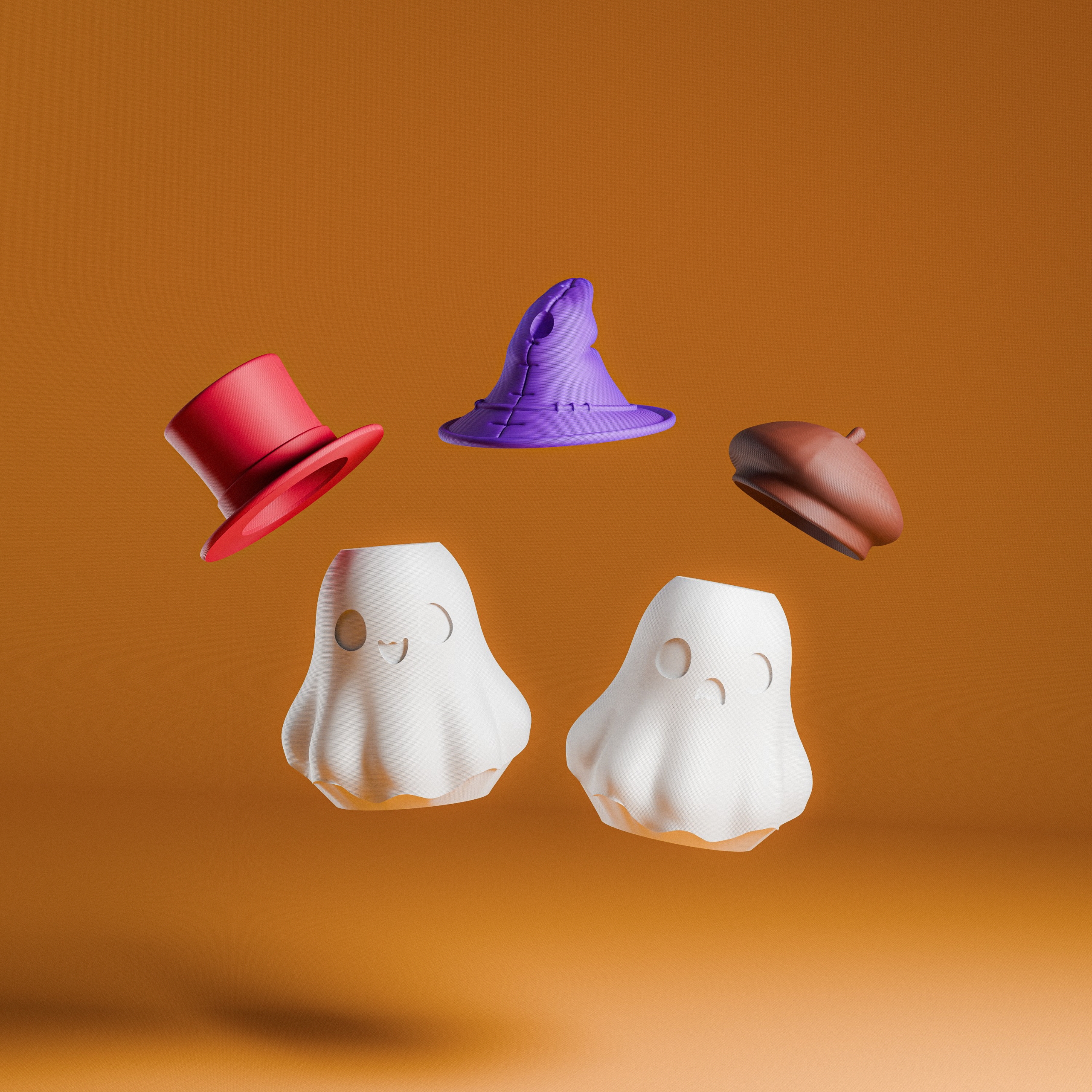 Un set personalizable de fantasmas impresos en 3D con distintos sombreros y expresiones, diseñado para velas LED. Ideal para sumar un toque lúdico y acogedor a tu decoración de Halloween.